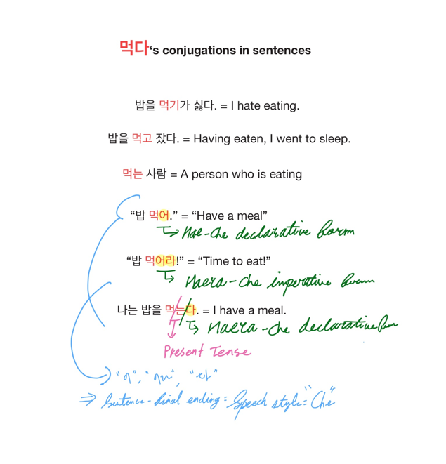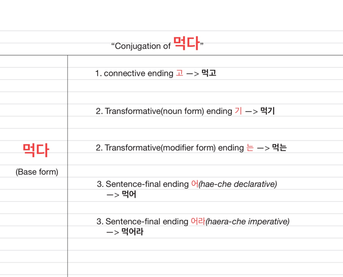 Let’s look at how the very last ending changes, using the verb “먹다.”
