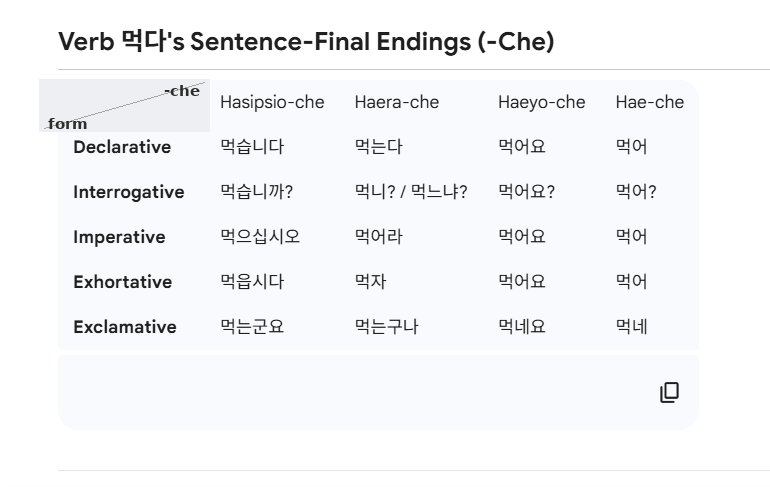 There are six types of -che, based on the verb “하다” (to do). These six -ches reflect the speaker’s attitude, and each one includes the five speech forms. In the examples below, I show only the four most commonly used -che.